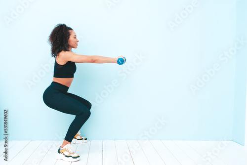 Fitness smiling black woman in sports clothing with afro curls hairstyle.She wearing sportswear. Young beautiful model doing squats.Female holding dumbbells in studio near light blue wall
