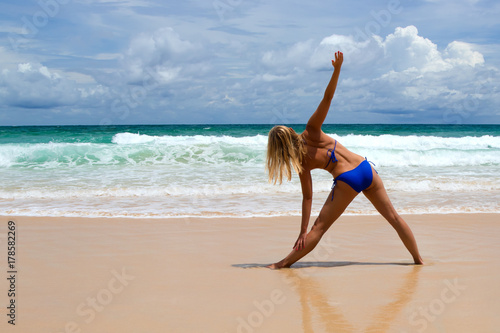 Fitness sport people and healthy lifestyle concept woman making yoga triangle pose on the beach.