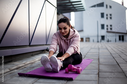 Fitness sport woman with fit body dressed black sportweart trainig workout outdoors against the street wall. Style sporty girl do morning activity excercise