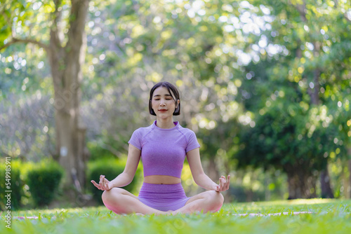 Fitness woman doing yoga in park, calm and relaxing women's happiness blurry background Asian woman meditating while practicing yoga concept of freedom peace and relaxation healthy