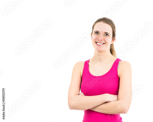 woman, work out, sport, healthy lifestyle, health, fitness, fit, healthy, sporty, pink, portrait, caucasian, girl, people, person, young, attractive, beautiful, smiling, smile, isolated, white background, female