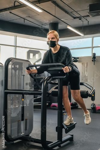 Fitness,sports.fit,Girl in mask fitness gym opening lockdown covid passport,QR cod Wellness, health care,generation z sports recreation concept online fitness apps. workout,training,Fit wellness