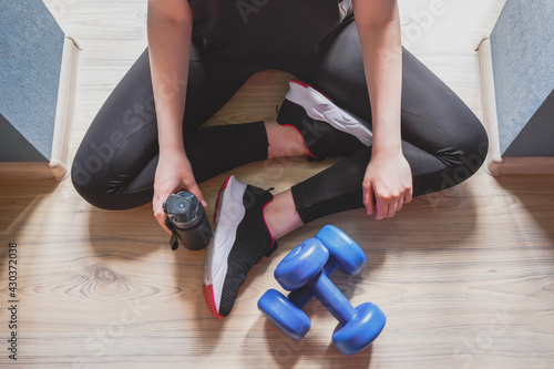Fit,sport.Home fitness,remote training online with virtual instructor.Woman in sportswear sitting floor with dumbbells home. Sports and recreation concept lockdown with fitness apps online.Home fit