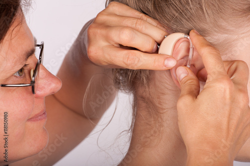 aid, caucasian, clinic, deaf, doctor, ear, equipment, examining, female, fitting, health care, hearing, horizontal, human, disease, impairment, medicals, medicine, patient, person, physical, practitioner, 2, woman