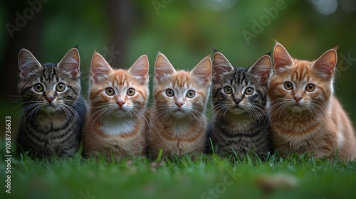 kitten, cat, grass, cute, furry, playful, pet, animal, nature, photo, companionship, whisker, paw, meow, tabby, ginger, striped, fur, eye, expression, adorable, grouping, young, small, sitting, lined, friends, family, warmth, innocence, environment, soft, light, serene, calmness, beauty, joy, happiness, cuteness, landscape, vibrant, colours, depth, sharpened, bokeh