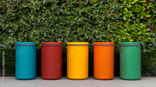 Five colorful recycle bins stand in a row against a leafy green hedge, promoting organized waste disposal and environmental awareness.