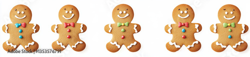 Five Delicious Decorated Gingerbread Men Cookies Isolated on White Background