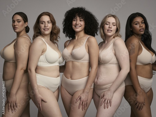 woman, diversity, underclothing, confidence, fashion, group, neutral, model, portrait, smile, curvy, fashionable, inclusive, female, beauty, empowerment, elegance, soft, casual attire, style, modern, natural, grace, trendy, photo, feminine, playful, collective, happy, bright, friendship, oneness, together, acceptance