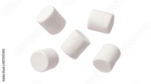 five fluffy white marshmallows scattered in a dynamic formation on a plain transparent background.