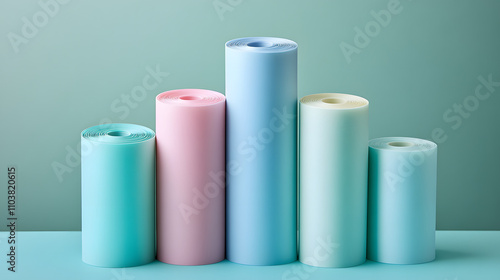 Five pastel-colored rolls of material stand in a row against a teal background, creating a visually appealing and minimalist arrangement. The colors are soft and pleasing to the eye.