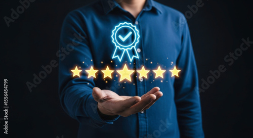 star, rating, client, satisfaction, excellent, service, quality, product, review, performance, life events, business, success, feedback, evaluation, achievement, award, badge, best, choice, check, mark, ribbon, seal, tick, top, vote, hand, holding, person, shirt, blue, glowing, neon, light, dark, background, concept, digital