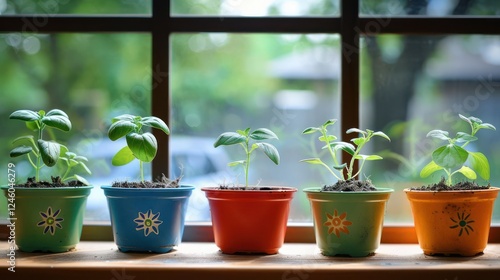 Five vibrant potted plants growing on a windowsill, with soft natural light and greenery outside