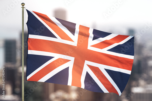Flag of Great Britain on blurry cityscape background