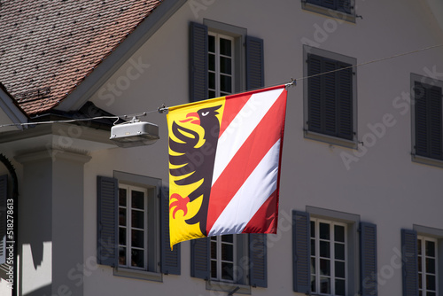 flag, center, exterior, house, background, alley, architecture, banner, black, building, city, culture, decoration, destination, downtown, eagle, europa, famous, historic, landmark, landscape, red, street, summer, sunny day, switzerland, symbol, tour tourism, holiday maker, town, traditional, travel, urban, waving, white, yellow