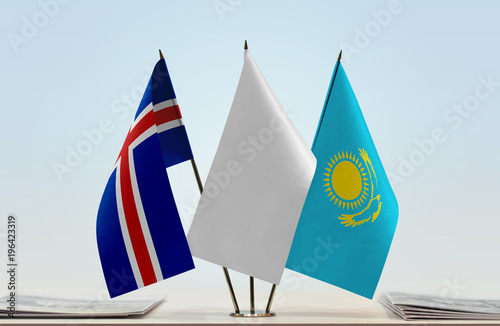Flags of Iceland and Kazakhstan with a white flag in the middle