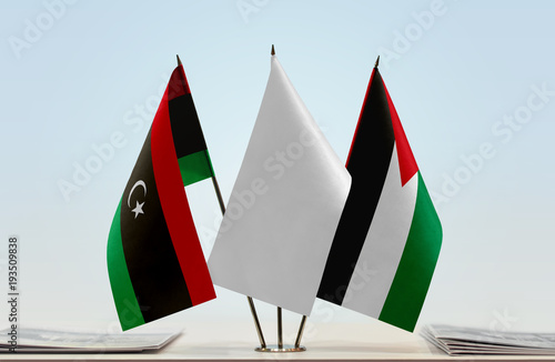 Flags of Libya and Palestine with a white flag in the middle