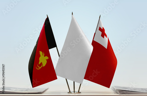 Flags of Papua New Guinea and Tonga with a white flag in the middle