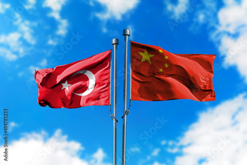 Flags of Turkey and China on the wind against blue sky
