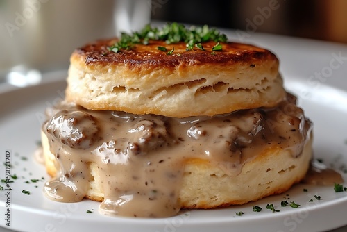 Flaky biscuit with creamy sausage gravy close-up high resolution image