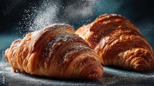 Flaky croissants dusted with powdered sugar.