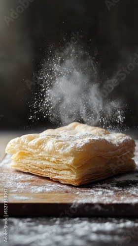 Flaky pastry sheets resting on a wooden surface with flour dusting in a cozy kitchen setting