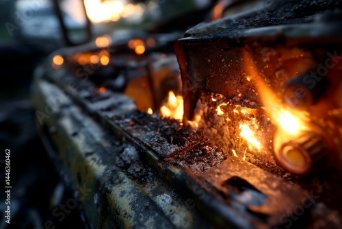 wreckage, fire, burn, car, auto, heat, destruction, flames, accident, intense, danger, emergency, ash, debris, metal, transport, crash, vehicle, disaster, safety, smoke, dark, background, damage, inferno, hot, risk, broken, insurance, scrap, macro, detail, closeup, textured, crisis, problem, meltdown