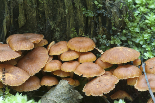 stump, stub, mushroom, small, forest, life, fungal, moss, wood, biology, colours, green, brown, orange, beige, yellow, honey fungus, candid, mycology