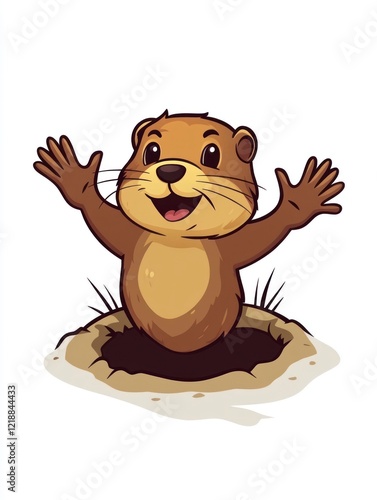 flat color cute cartoon groundhog emerging from a hole and waving, against a white background, with simple shapes and lines. Groundhog day.