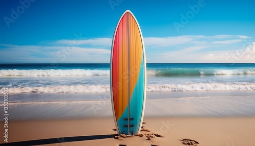 Flat, colorful surfboard standing upright in soft sand, gentle ocean waves in the background, bright sunny sky, tropical beach scene, summer vibes, minimalist, playful and relaxing illustration.
