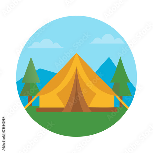 Flat design camping tent illustration in a circular frame