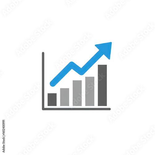 Flat design icon of a bar chart with blue upward arrow, representing business growth, performance improvement, and financial success.