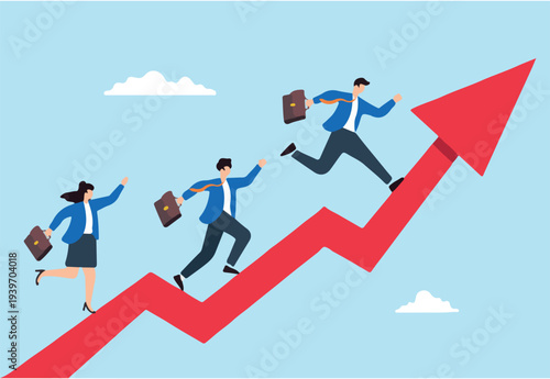 Flat illustration business people run up rising arrow symbolizing business and career growth