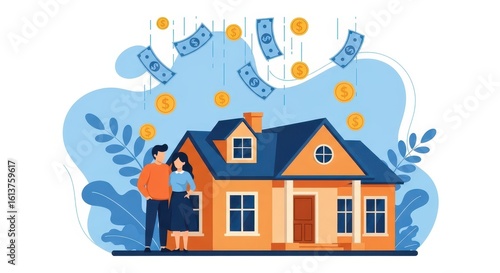 Flat illustration of a couple stands before their new home as money rains down, symbolizing financial success