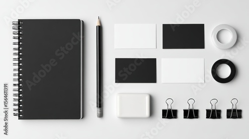 stationery, notebook, crayons, binder, clip, minimalist, office, black, white, paper, writing, eraser, desk, creative, business, school, design, equipment, tool