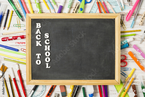 Flat lay chalkboard surrounded by school supplies