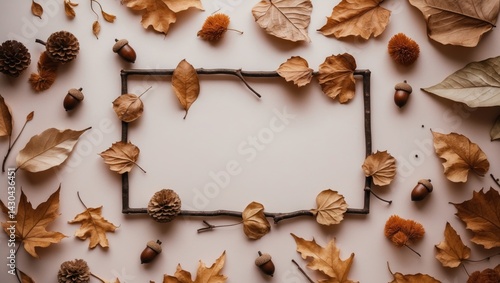 Flat lay composition featuring dried flowers and leaves on a pastel background with a frame, ideal for Thanksgiving and autumn themes.