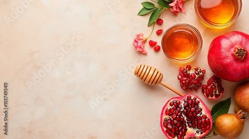 apple, background, composition, concept, delicious, dessert, drink, flat, flower, food, fresh, fruit, healthy, holiday, honey, lay, leaf, natural, nature, organic, pomegranate, red, sweet, table, tasty, top, view, white, wooden, yellow