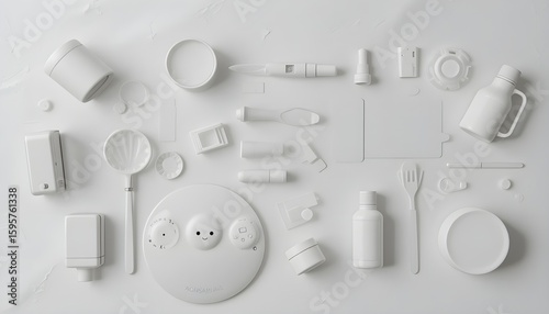 Flat lay of 10 white everyday objects on a soft white background, minimalistic and well-lit"