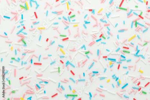 flat lay of colorful sprinkles over white background, festive decoration for banner, poster, flyer, card, postcard, cover, brochure, designers