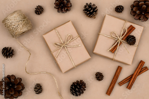 Flat lay of handmade holiday crafts including kraft paper, twine, pine cones, and cinnamon sticks, rustic holiday gift wrapping, horizontal layout.