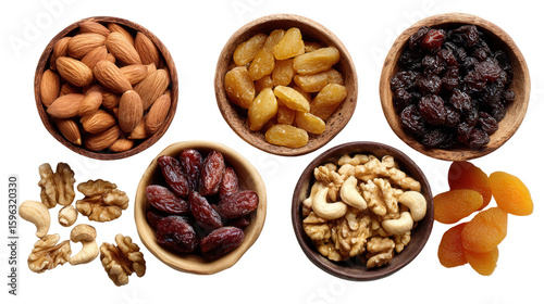 Flat Lay of Healthy Snacks and Nuts: A flat lay featuring healthy snacks like almonds, walnuts, and dried fruit, isolated on a Transparent background, PNG file.