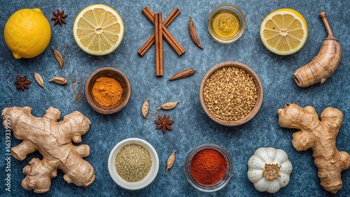 Flat lay of herbal cure ingredients featuring ginger, lemon slices, cinnamon sticks, anise stars, chili peppers, turmeric powder, ginger roots, garlic bulbs, and spices against a blue backdrop with