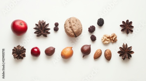 Flat Lay of Seasonal Fruits and Nuts on White Table