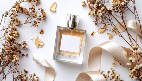 Flat lay of transparent classic perfume bottle with dried flowers and silk ribbon, empty space for label or logo design, high-end beauty brand mockup