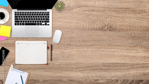 flat lay workspace table with laptop computer, office supplies, coffee cup, tablet and cell phone on wooden background