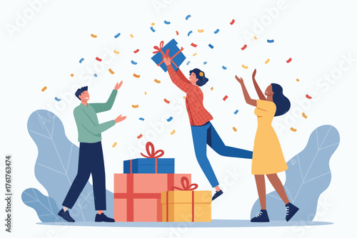 Flat realistic promo banner design featuring diverse people interacting professionally in a modern office.