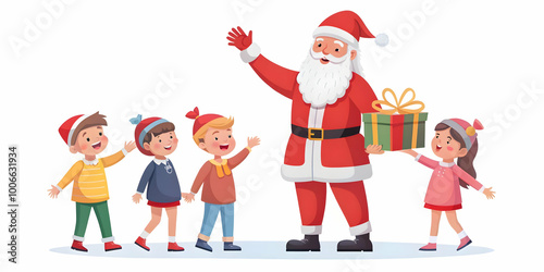 Flat Santa Giving Gifts to Children: Heartwarming Scene of Excited Kids and Delighted Expressions in Simple Vector Illustration