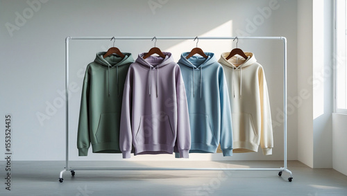 hoodie, fashion, clothing, apparel, minimalist, studio, display, neutral, modern, pullover, casual attire, unisex, cotton, branding, clothes rack, hanger, soft, oversize, sweatshirt, pastel, clean, cosy, daylight, organised, gradient, rack, layout, muted, e-business, showroom, fabric, textile, essential, beige, lilac, sage, grey, blue, neat, trendy, stylish, warm, wearable, lifestyle, everyday, comfy, garment