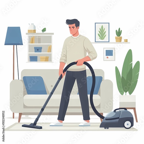 Flat Style Illustration of a Man Vacuuming the Living Room, White Background