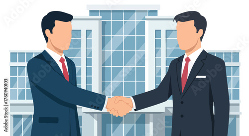 Flat style illustration of two businessmen shaking hands in front of an office building, representing partnership, agreement, trust, and successful corporate collaboration